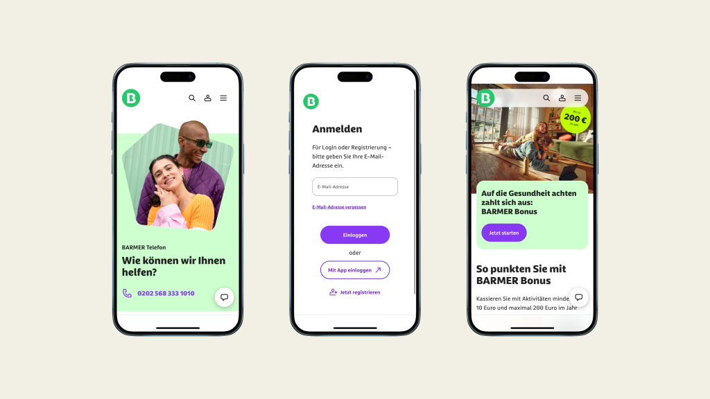 From day one, digital services sit at the heart of the design. You notice this at first sight in the bright green that is optimized for screens yet still typically BARMER. But you can also experience it in the clear user journeys and in the uncompromising standards of accessibility. So every member can quickly find what they need. Including powerful tools for a healthy life.