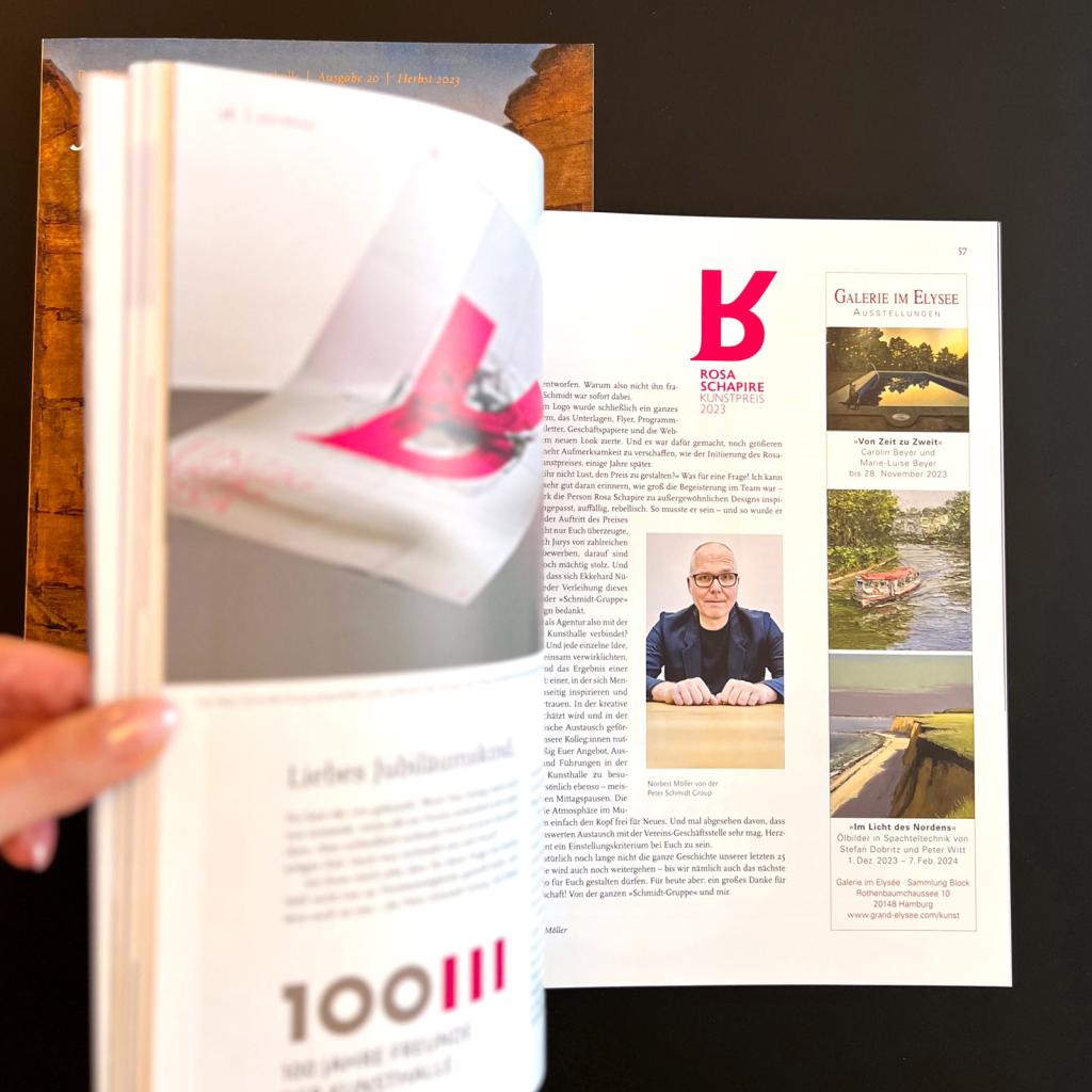 The logo eventually grew into an entire design system that adorned documents, flyers, program booklets, newsletters, business stationery, and the website. The new look was also ideal for attracting attention to even more ambitious projects, such as the inauguration of the Rosa Schapire Art Award one year later.